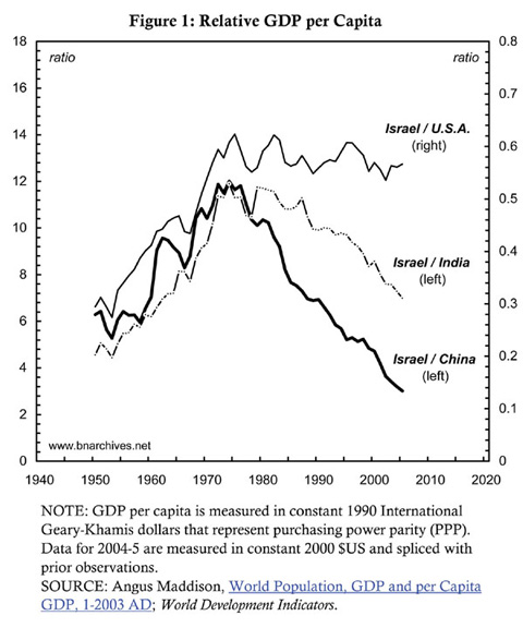 From that point onward, though, the process inverted. China’s per capita GDP soared, Israel’s lingered, and the ratio between them dropped precipitately. In 2005, Israel’s per capita GDP was only 3 times bigger than China’s, representing a four-fold relative decline since the mid 1970s.