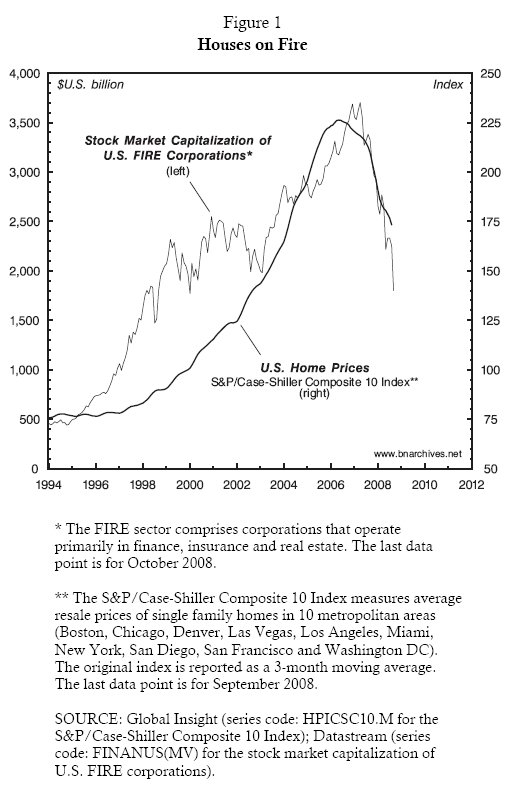 As Figure 1 shows, in July 2006, U.S. house prices started to drop. Initially, investors hung in suspension. Pretending as if nothing had happened, they continued to buy FIRE stocks, pushing the market even higher. But the downward spiral in house prices persisted — and then, suddenly, in May 2007, everyone started rushing for the door. By September 2008, house prices were down nearly 25% relative to their 2006 peak, while U.S. FIRE stocks went into free fall. In October 2008, the total market capitalization of the sector was more than 50% below its May 2007 peak.