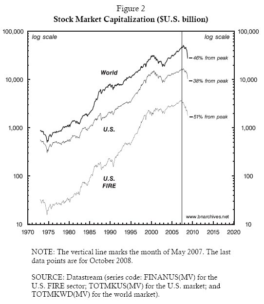 The data show that, while the U.S. FIRE sector started to drop in May 2007 (marked by the vertical line in the chart), the overall U.S. and global stock markets took another five months before tanking. However, once the broad reversal started, the downward convergence was swift. From October 2007 to October 2008, U.S. listed corporations lost 38 per cent of their market capitalization, while the global market lost 46 percent.