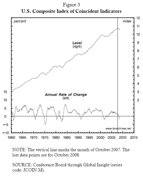 The figure presents two manifestations of the index: one is the actual level; the other is the annual rate of change, calculated by comparing the same month in successive years (so that the reading for October 2008 denotes the rate of change from October 2007, etc.). The growth series, plotted at the bottom of the chart, shows that the “real economy” started to decelerate at the end of 2006. But the actual level of the index, depicted by the top series, peaked at the end of 2007 (marked by the vertical line in the figure) and started its month-to-month declines only in early 2008.