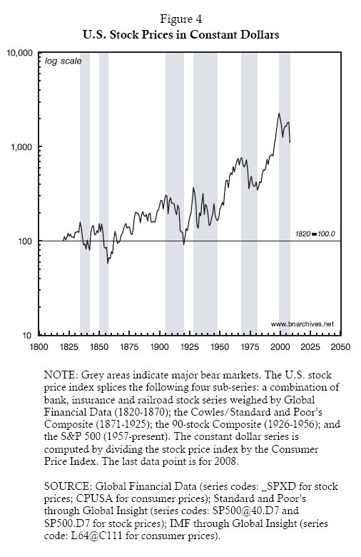 With this qualification in mind, let us return now to Figure 4. The chart shows the stock market index in constant prices, plotted against a logarithmic scale. The vertical grey bars indicate what we consider to be major bear markets — i.e., periods during which the stock market suffered protracted declines.