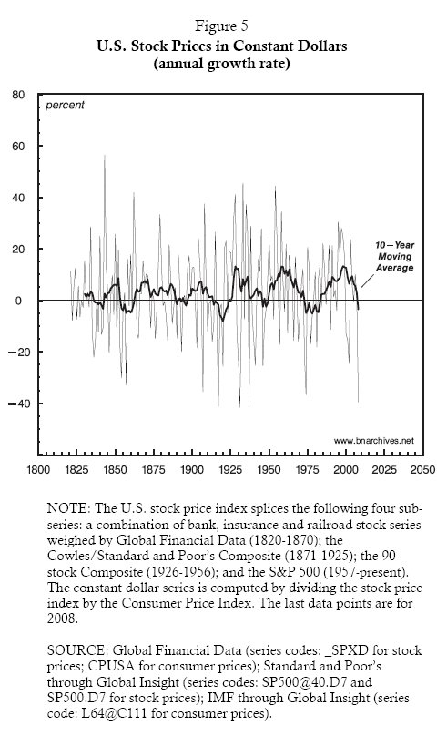 A similar picture emerges from Figure 5, which measures the annual growth rate of the stock market index (again, in constant dollars). The thin line in the chart shows the percent variation from year to year. The thick line smoothes these variations as a 10-year moving average — meaning that every observation in the series measures the average annual growth rate in the previous ten years.
