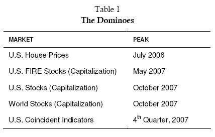 According to the mismatch thesis, the current turmoil started in the U.S. housing market. This was the epicenter. From here the tremor spread like a tidal wave: first to the entire U.S. FIRE sector (an acronym for “finance, insurance and real estate”), then to every financial market around the world, and finally to the so-called “real economy.” This domino sequence is listed in Table 1 and illustrated in Figures 1, 2 and 3.