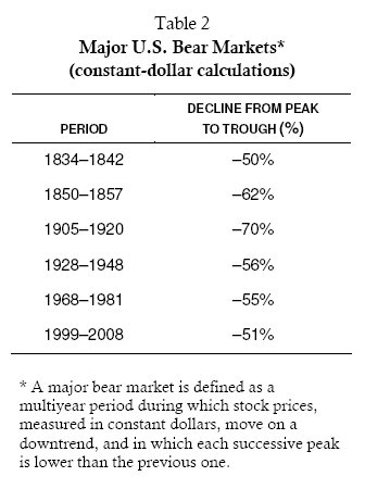 As it turns out, there is no general definition for a bear market—let alone a “major” one. So we’ve devised our own. In what follows we define a major bear market as a multiyear period during which stock prices, measured in constant dollars, move on a downtrend, and in which each successive peak is lower than the previous one. According to this definition, over the past two centuries, the United States experienced six major bear markets. These periods are listed in Table 2, along with the cumulative declines in stock prices.
