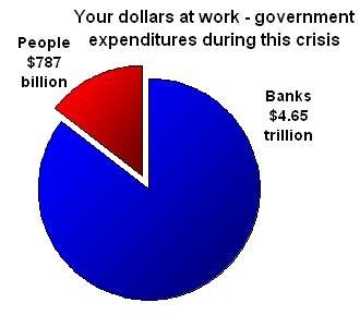 Graph: The banks received $3.2 trillion through the Federal Reserve, a $700 billion bailout in October, 2008 and 2009 budget item for another $750 billion bailout. An unspecified number of citizens will benefit from the recently passed $787 billion stimulus bill.