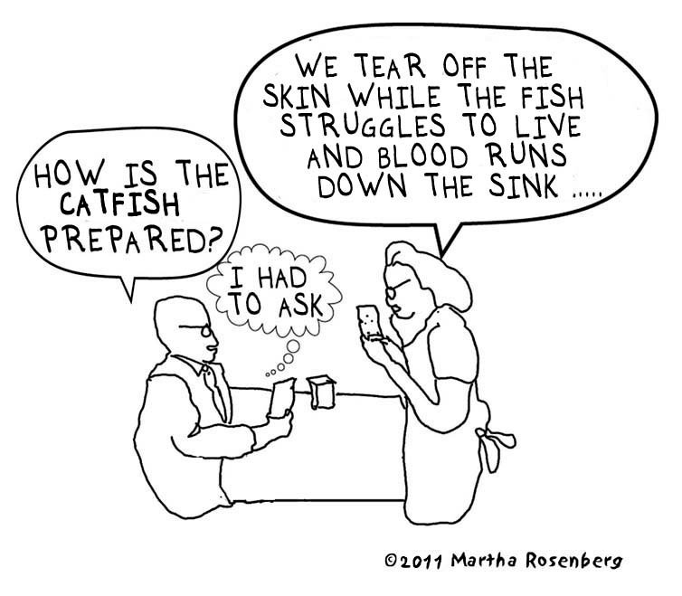 In an incident filmed on September 26, 2010, a catfish being slaughtered never stops opening and closing his or her mouth and trying to escape, as blood runs down the side of the sink and skin is removed. Eventually the camera view is blocked.