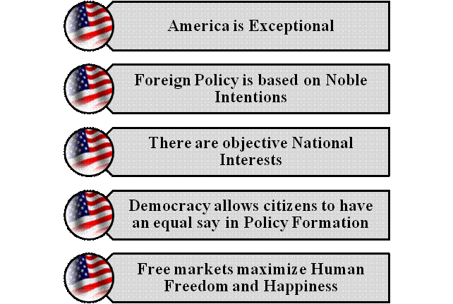 From this principle, it naturally follows that American foreign policy is based on noble intentions, and that its only faults stem from beneficent motives sometimes gone awry due to incompetence or misunderstanding and a propensity to “judge” itself “by higher standards” than the rest of the world. ((Dinesh D’souza (April, 2002). In praise of American empire. Christian Science Monitor. )) Domestically, neoliberal nationalism propounds the idea that America is a free market country and that free markets promote happiness and justly recompense citizens for their economic behavior, or, more elegantly and oleaginously “free-market capitalism is far more than an economic theory. It is the engine of social mobility — the highway to the American Dream.” ((George W. Bush (Nov 13, 2008). Bush’s speech on the economic crisis, November 2008. Council on Foreign Relations.)) This is coupled with the idea that America is a democracy that allows each citizen to have equal input into policy formation to create a “fairness” narrative that justifies the current state of affairs by noting that “free markets” are just and that all citizens have equal political say.