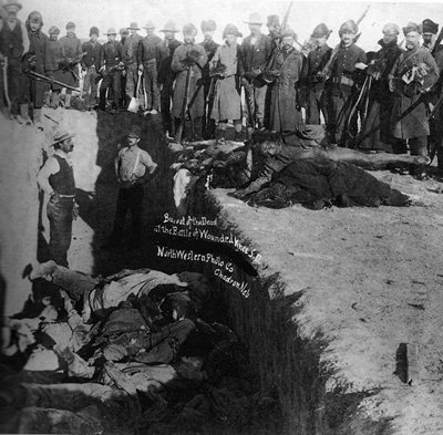 US soldiers pose over a mass grave with some 300 bodies of innocent Native American Lakota Sioux, two-thirds women and children, massacred at Wounded Knee, Pine Ridge Reservation in 1891.