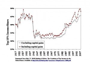 The media are, in a very real sense, an extension of the centers of domestic power; therefore, it is important to understand and criticize these domestic power centers. Significantly, domestic power and policy has shifted dramatically since the 1960’s, leading from the Keynesian era to the triumph of neoliberalism (or, what has been aptly dubbed ‘the Age of Greed’ by Jeff Madrick. ((Madrick, J. (2011). The age of greed: The triumph of finance and the decline of America, 1970 to the present. New York: Alfred A. Knopf.)) This shift has profoundly impacted society, drastically increasing inequality (see figure 1 ((Emmanuel Saez (July 17, 2010). Striking it Richer: The Evolution of Top incomes in the United States (Updated with 2008 estimates). )) ), while concomitantly decreasing investment in social programs and infrastructure. In other words, an increasingly small fraction of society (a small coalition) has appropriated more of the resources. Noam Chomsky has been a leading critic of this trend, consistently pointing out the astonishing disconnect between the narratives used to justify this pattern of appropriation (“free markets dispassionately distributing resources”) and the reality behind it. In a society where narratives often serve the function of the bludgeon, it is important to escape one’s voluntary servitude by increasing one’s knowledge of 1) economic and political reality and 2) the content of the narratives used to justify the underlying reality.