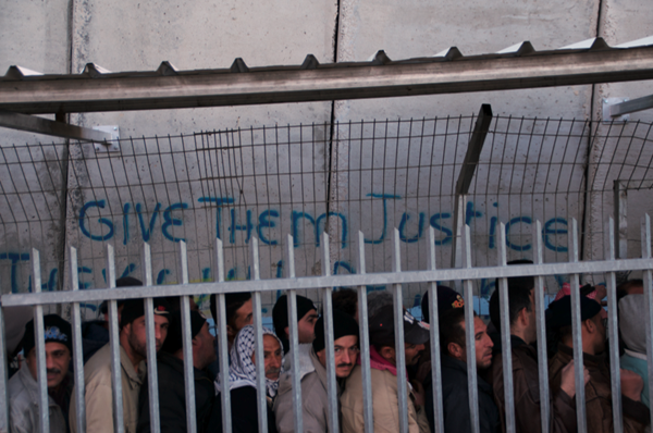 Although text accompanies the evocative photographs, the photos speak for themselves. Against the Wall depicts Palestinian families being separated from one another, being prevented from tending to their crops, Israelis inflicting economic deprivation on Palestinians, Israelis targeting of school children, and Israelis intended humiliation of Palestinian workers passing through checkpoints in the wall. ((I write “intended humiliation” because, in fact, it portrays the dignity of Palestinian workers who day-in and day-out withstand the indignities to support their families – an honourable act – and it is rather a self-humiliation for the Israelis that people in positions of power would lower themselves to behave so inhumanely to other humans.)) Against the Wall reveals the spirit, art, and determination of the Palestinian resistance, the anger of the occupied people, messages to the world, etc.