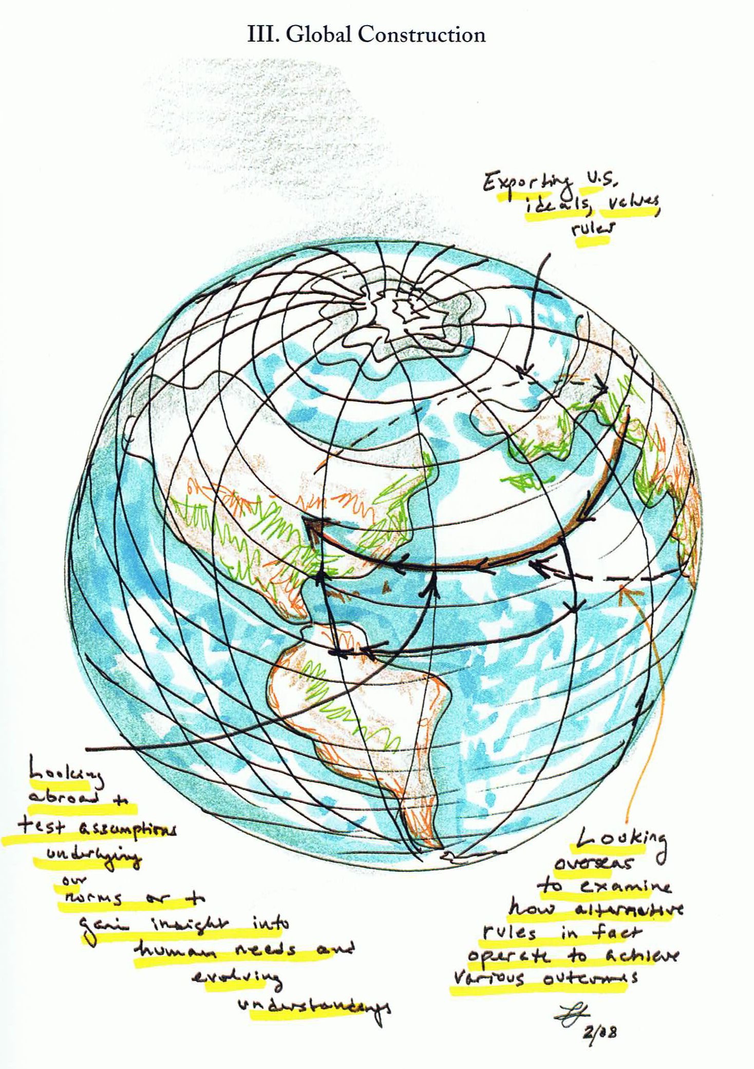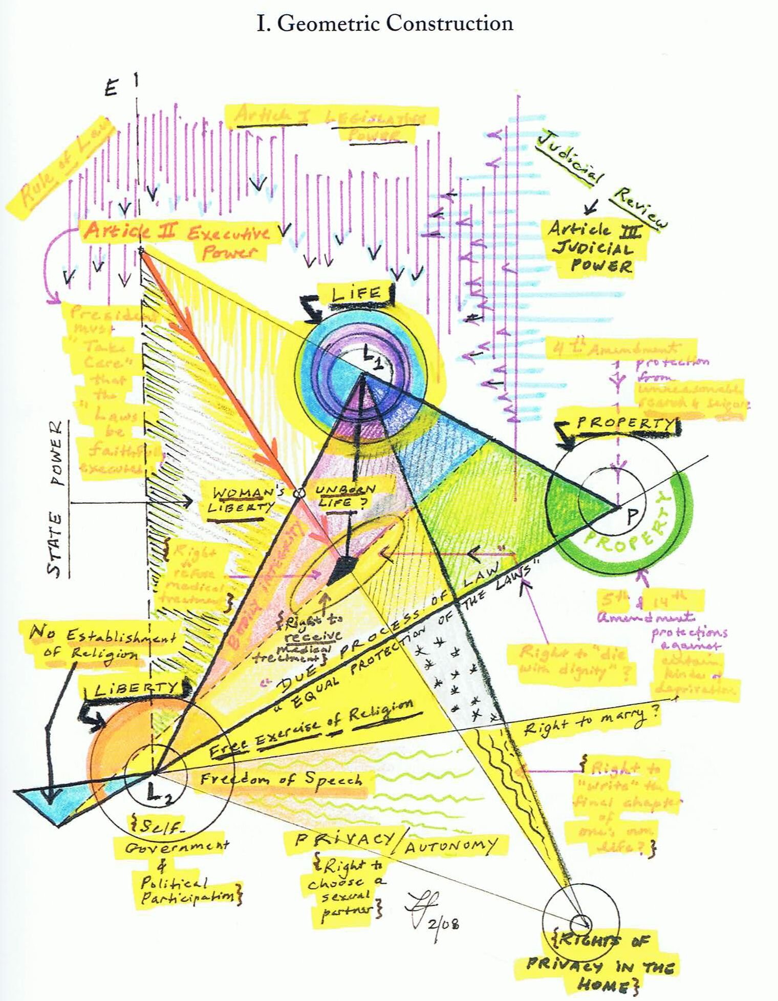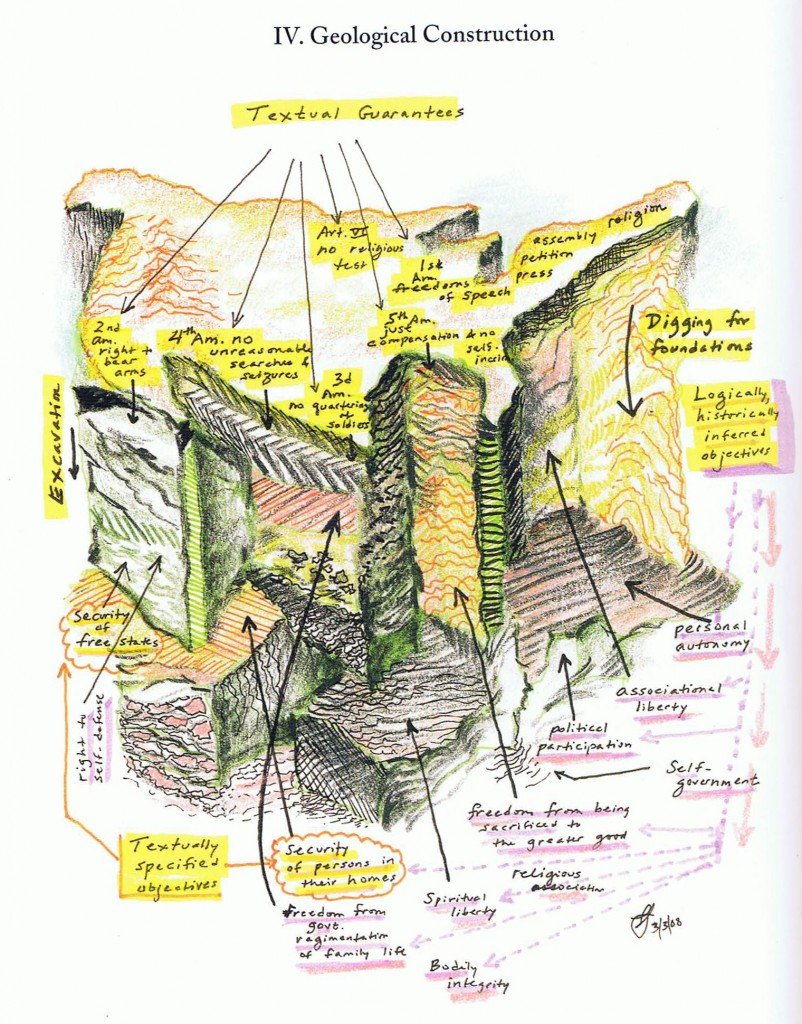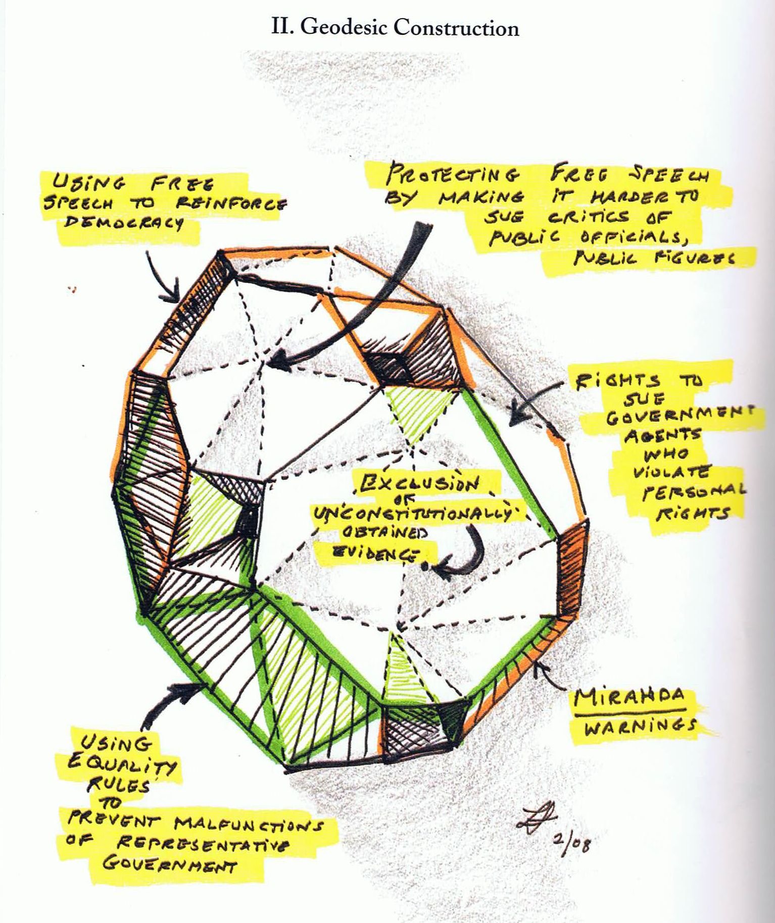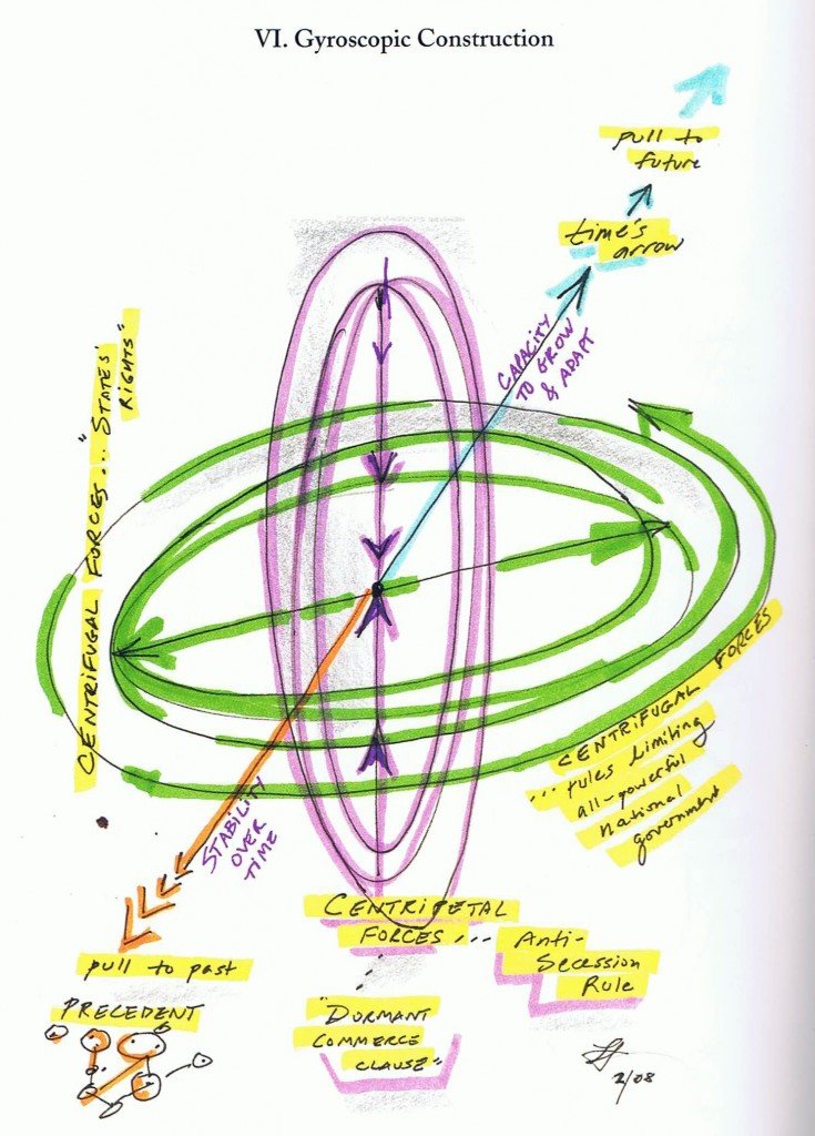 THAT THERE IS MORE ‘out there’ than is encompassed in constitutional text, and that much of what is out there nonetheless counts as part of our Constitution, now seems plain enough. What remain to be addressed are the processes by which we might best visualize and articulate the rules, principles, and rights that are part of our Constitution but are not discernable in or directly derivable from portions of its text.…I would identify six distinct but overlapping modes of construction in forming the invisible Constitution: geometric, geodesic, global, geological, gravitational, and gyroscopic.…Here are my drawings—one for each of the six ways of constructing the invisible Constitution—presented as I created them rather than in a professional rendition, in the belief that any reduction in clarity will be more than offset by the gains in vibrancy and immediacy. ((p. 155.))