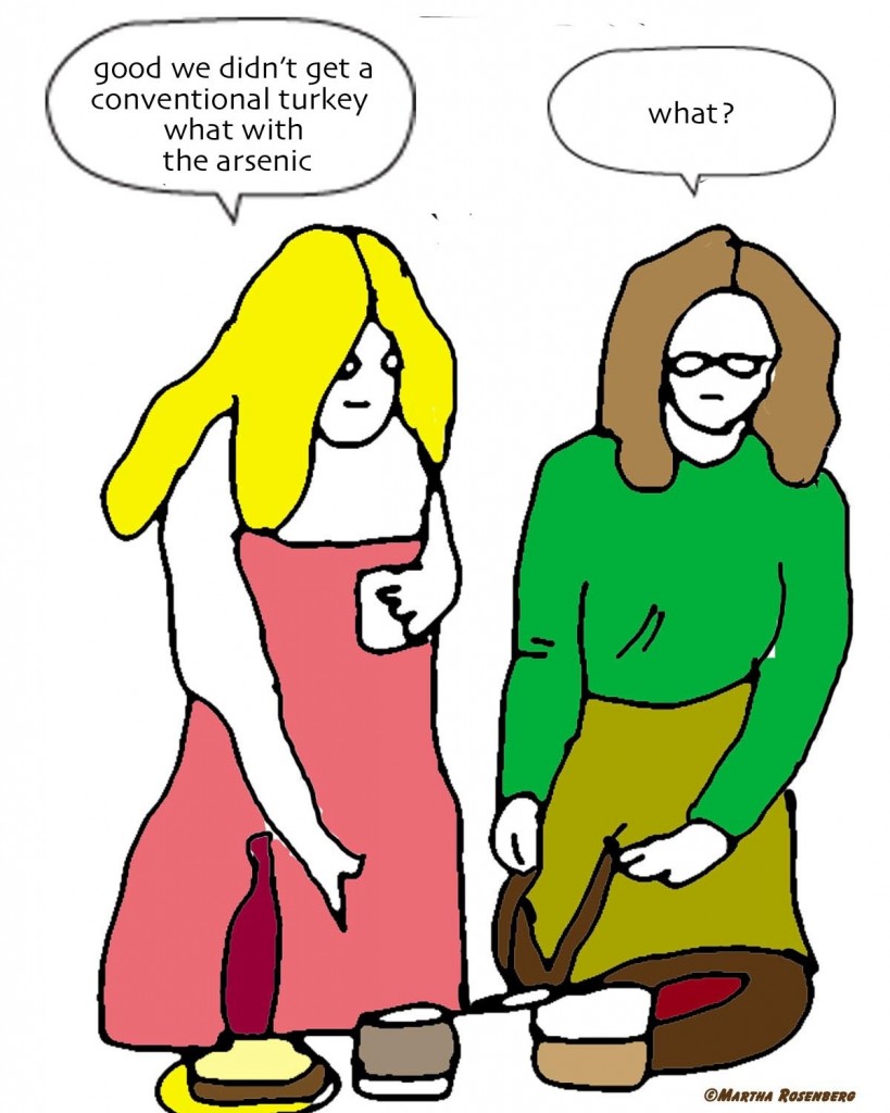 In June, Pfizer announced it was ending arsenic-containing chicken feed which no one realized they were eating anyway but its arsenic-containing Histostat, fed to turkeys, continues. Poultry growers use inorganic arsenic, a recognized carcinogen, for “growth promotion, feed efficiency and improved pigmentation,” says the FDA. Yum.