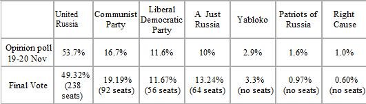 The table below contains significant details for resolving the debate on election validity. It shows that the election results were close to the trend in the polls and to their final readings. If United Russia (UR) did much better than the polls, then fraud would be a definite probability. By doing worse than predicted, either the UR poorly prepared the mechanisms for illegally augmenting vote totals, or the mechanisms did not exist.
