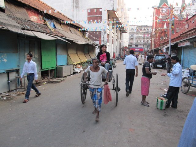 The Esplanade district is a large commercial area in the heart of Kolkata, India. On a warm February day while heading toward the markets on Lindsay Street, I observed a pair of rickshaw pullers hauling their human cargo along at a brisk trot.