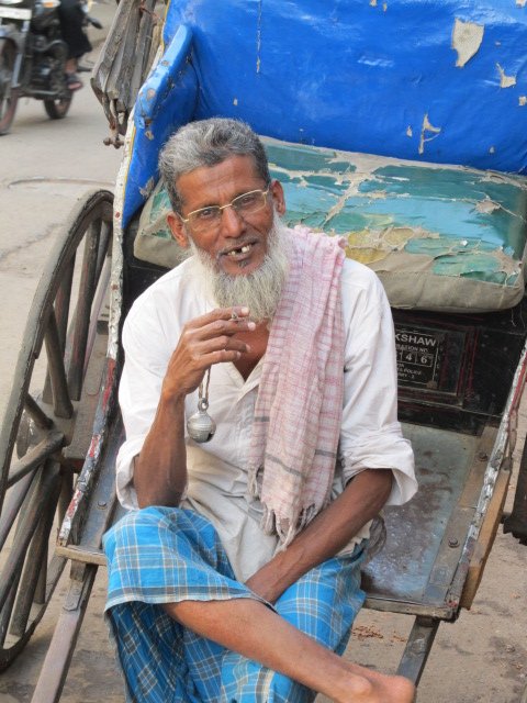 One block over on Sudder Road, where most of the backpackers hang out, sat a wiry bare-foot man wearing a lungi (skirt) and a gumcha (cloth) wrapped around his head. His name is Mohammad Salim. He is a 62-year-old husband and father of six children from Bihar, in the north of India, and he is one of the last rickshaw pullers.
