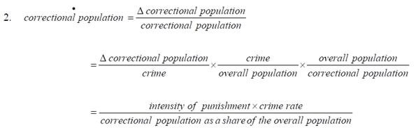 So let’s decompose the rate of change of the correctional population. Mathematically, this rate of change comprises three components: (1) the intensity of punishment, proxied by the change in the correctional population relative to crime; (2) the crime rate, measured by the ratio of crime to the overall population; and (3) the correctional population as a share of the overall population. The decomposition is given by Equation (2):