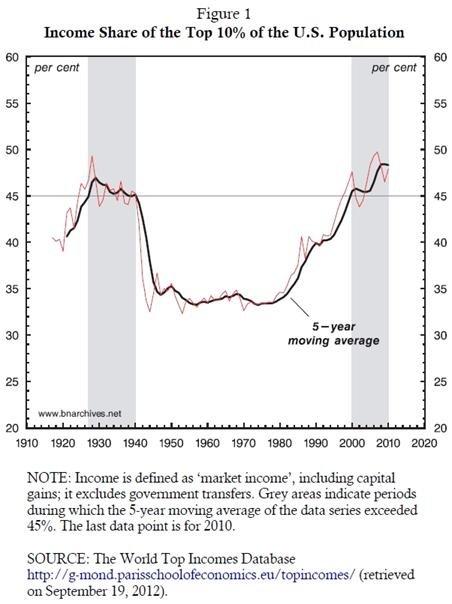 Figure 1 shows the income share of the top 10 per cent of the U.S. population. This share offers a proxy, however imperfect, for the power of the ruling class and the thick power belt that supports it. The shaded areas in the figure denote two historical extremes – periods during which the income share of the top 10 per cent of the population exceeded 45 per cent. During the 1930s, this share approached 47 per cent of total income. And in retrospect, that level proved to be the asymptote of capitalist power. Pushing against it triggered a systemic crisis, followed by the complete creordering of the U.S. political economy and a sharp decline in capitalist power, proxied here by a large drop in income inequality. The situation now is remarkably similar, both quantitatively and qualitatively. During the 2000s, the income share controlled by the top 10 per cent of the population approached 48 per cent, a level whose attainment and sustainment required the ruling class to subject the underlying population to increasing doses of violence, pain and sabotage.