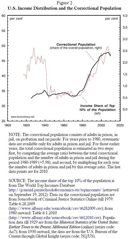 The goal of today’s presentation is to examine the darker side of this struggle. In the past, resistance to capital was associated with production, workers, left political parties, strikes and mass demonstrations. But as the world changed, new forms of resistance and retaliation have emerged, and the ones we will look at today are crime and punishment. We will start with the two charts that ended last year’s presentation – charts in which we related the distribution of income and capital on the one hand with the extent of state punishment on the other.