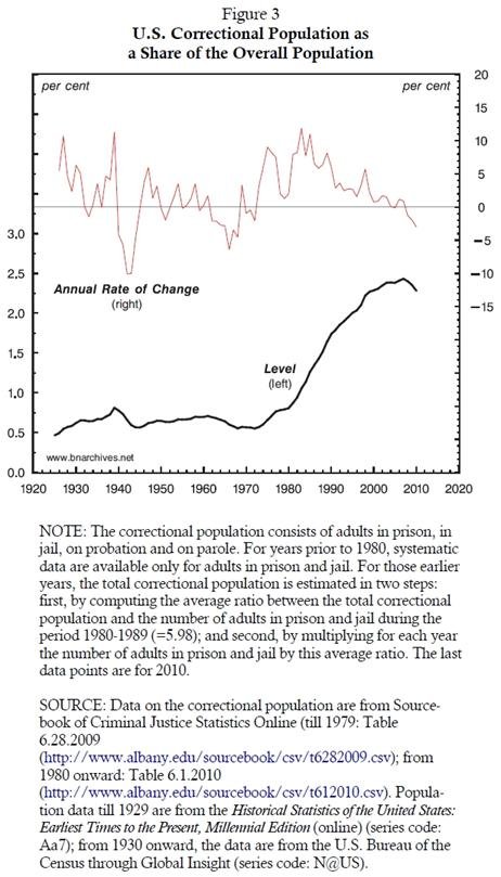 Now, let us focus on the correctional population. In Figure 3, the black series at the bottom denotes the correctional population as a share of the overall population (which we take from Figure 2). The top red series shows the annual rate of change of the bottom series. Historically, this rate of change has fluctuated between ?10 and +10 per cent, and the question we need to ask is what drives these changes: Why did the correctional population remain fairly stable till the late 1970s? Why did is soar during much of the neoliberal 1980s and 1990s? And why did it level off in the 2000s?