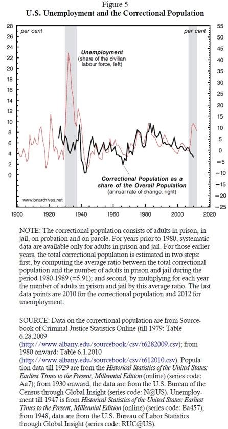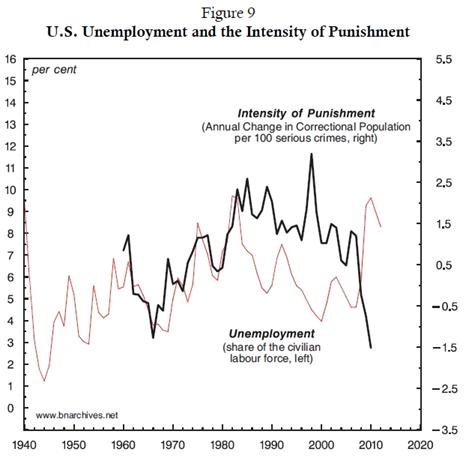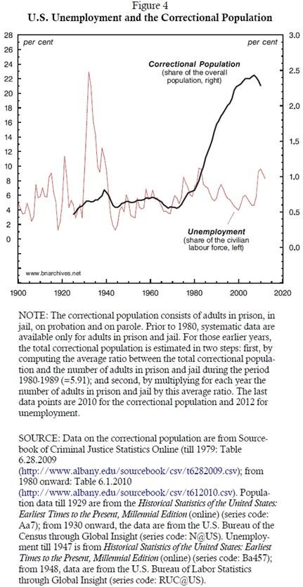 • We can see that, for much of the past century, changes in the U.S. correctional population were almost perfectly ‘explained’, at least statistically, by changes in the rate of unemployment. Rusche was right – indeed more right than he could have anticipated. According to the figure, there is no need for complicated models, multiple variables and assorted excuses (when the models fail). The two forms of sabotage – unemployment and penality – mirror each other almost perfectly.