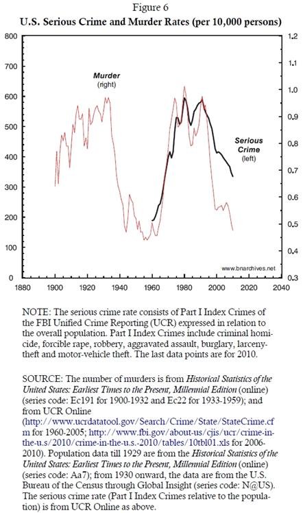 Unfortunately, we do not have unified serious crime statistics for years prior to 1960. But we do have data for the murder rate, depicted here in red. The number of murders of course is much smaller that the overall number of serious crimes. In 1980, for instance, for every 10,000 people there were 600 serious crimes but only one murder. The key for our purposes, though, is that the two series are highly correlated. And if this correlation also held prior to 1960, it implies that the U.S. crime rate has followed a fairly stylized long-term cycle.