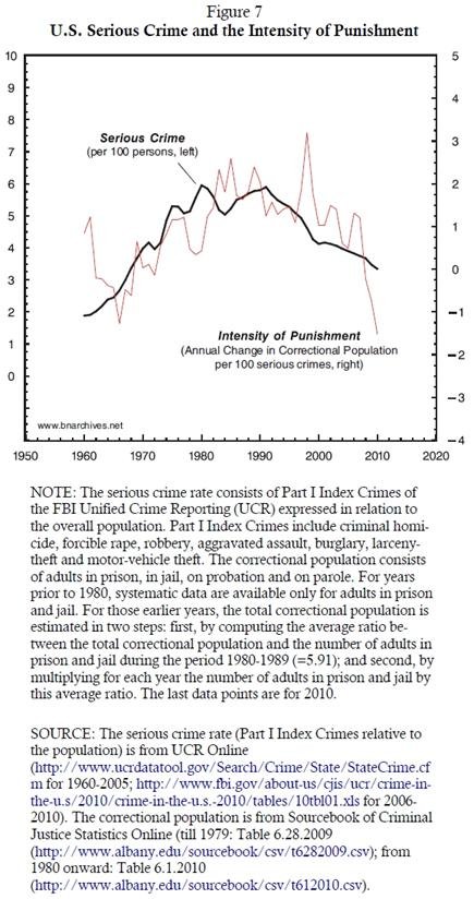 Bearing this cyclicality in mind, we can move to Figure 7. The thick black line in the figure measures the serious crime rate per 100 people. The chart also shows the intensity of punishment, proxied by the thin red line. If you look at Equation (2), you can see that this intensity is measured in two steps. The first step is to compute net change in the correctional population. For example, in 2010 the correctional population fell by 157,000. This figure represents, for that year, the number of people who were caught, tried and sentenced, less the number of those released. For 2010 the net figure was negative – there were more people leaving the correctional system than entering it. The second step is to divide this net change by the number of serious crimes reported that year and multiply the result by 100. This computation gives us the net change in the correctional population per 100 crimes. In 2010, this ratio was ?1.5, which means that for every 100 serious crimes, there were 1.5 people deleted from the correctional population. By contrast, in 1998 the number was +3.2, which means that for every 100 serious crimes, there were 3.2 people added to the correctional population. Note that this is a ‘composite measure’ that reflects four different processes: (1) the efforts and the effectiveness of the police; (2) changes in the legal code; (3) the harshness of the courts; and (4) the release rate of those previously sentenced.