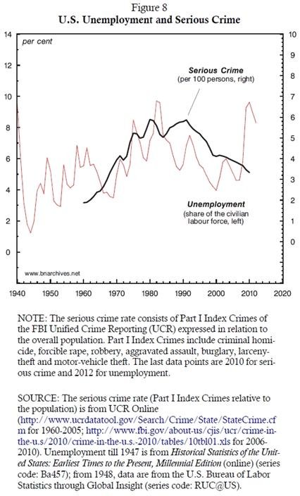 Figure 8 shows the relationship between the serious crime rate and the unemployment rate since the 1960s. In general, the data seem consistent with Rusche’s hypothesis, at least until recently. They show the two processes to be moving in tandem, rising until the 1980s and receding afterwards. But by the late 2000s, the relationship between unemployment and crime seems to have broken down: while unemployment has risen sharply, the crime rate, instead of increasing, has continued to drop.