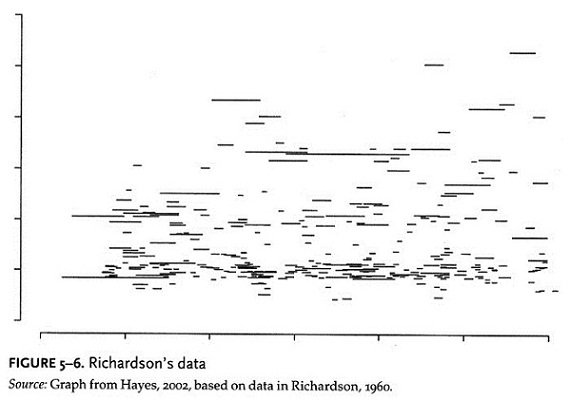 But this is a sleight-of-hand method, and manufactures its own counter-illusion. Figure 5-6, “Richardson’s data,” ((Figure 5-6 appears on p. 205 of Pinker’s book. Pinker takes Figure 5-6 from Brian Hayes, “Computing Science: Statistics of Deadly Quarrels,” American Scientist, Vol. 90, No. 1, January/February, 2002, p. 13.)) is based on Lewis Fry Richardson’s mid-20th Century book, Statistics of Deadly Quarrels. It depicts 315 armed conflicts between 1800 and 1950.