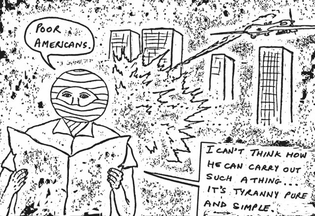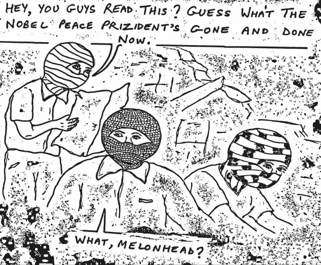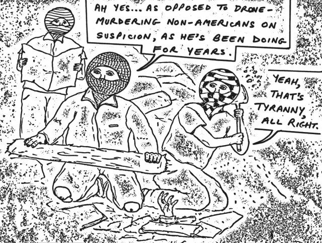 Good thing we’re safe from fiendly neighborhood terrorists, like Raghead and his bunch. We’re Americans. They’re jealous of our freedoms! But we’ve got the mightiest military on earth to…protect us?