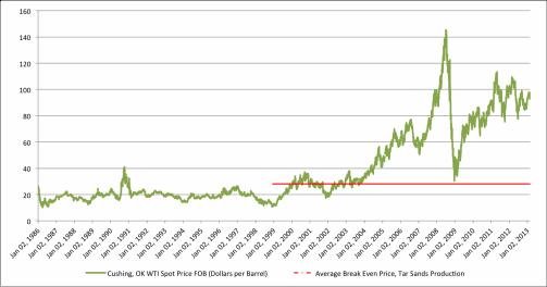 Pretty official looking huh? The green line is the price of a barrel of West Texas Intermediate Crude. The red line is the average break-even point of a tar sands producer.