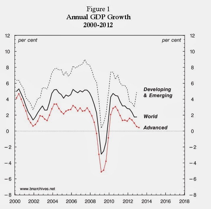 Figure 1 provides the broad context (click on image below). The chart is a snapshot the ‘state of the world economy’ since the beginning of the systemic crisis in the early 2000s. The figure shows three annual GDP growth rates: (1) the dotted red line is for the advanced countries, (2) the dashed line is for the developing world, and (3) the solid line is for the world as a whole. We can see the first downturn in 2000-2002. The developing world and emerging markets recovered briskly from this decline, but the advanced countries showed a very feeble recovery. Then came the 2008-9 drop. This downturn was much [more serious (–5 per cent for the developed world and –3 per cent for the world as a whole). And the recovery was limited and brief. By 2010, both regions – and the world as whole – began to decelerate rapidly.