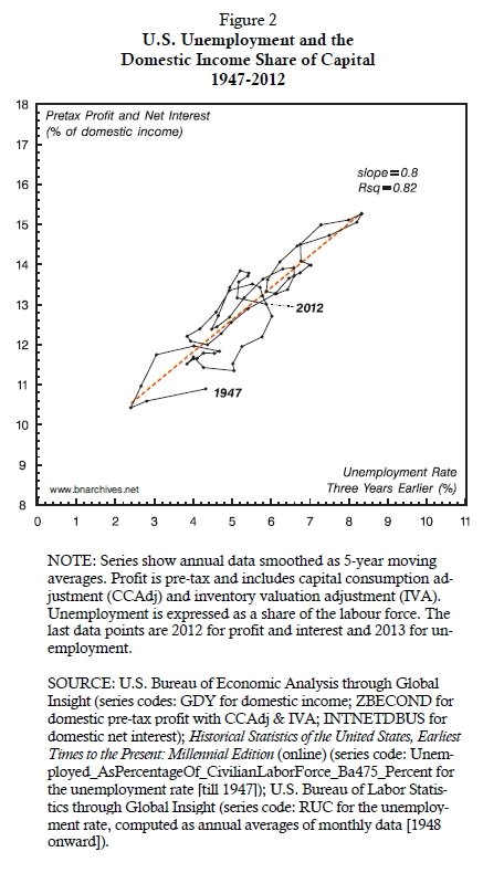 The relationship between the two series in the charts is clearly positive and very tight. Regressing the capitalist share of domestic income against the rate of unemployment three years earlier, we find that for every 1 per cent increase in unemployment, there is 0.8 per cent increase in the capitalist share of domestic income three years later (see the straight OLS regression line going through the observations in Figure 2). The R-squared of the regression indicates that, between 1947 and 2012, changes in the unemployment rate accounted for 82 per cent of the squared variations of capitalist income three years later. ((The three-year lag means that the redistributional consequences of unemployment are manifested only gradually. The exact nature of this gradual process requires further research.))