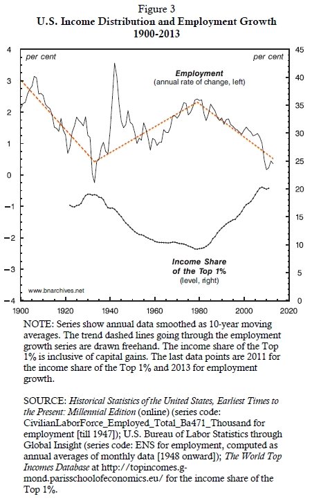 Figure 3 shows the century-long relationship between the income share of the Top 1% of the U.S. population and the annual growth rate of U.S. employment (with both series smoothed as 10-year moving averages).
