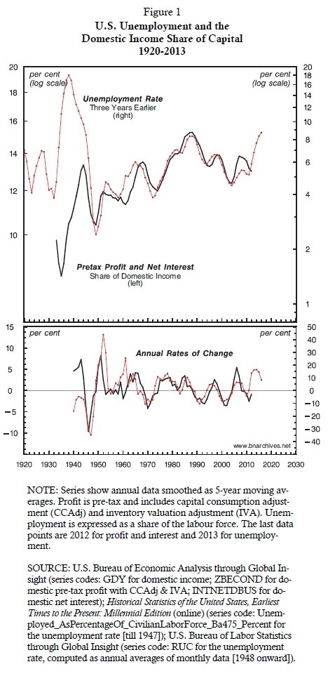 The empirical patterns shown in Figures 1 and 2 seem consistent with theories of underconsumption, particularly those associated with the Monopoly Capital School. According to these theories, the oligopolistic structure of modern capitalism is marked by a growing ‘degree of monopoly’. The increasing degree of monopoly, they argue, mirrors the redistribution of income from labour to capital. Upward redistribution, they continue, breeds underconsumption. And underconsumption, they claim, leads to stagnation and crisis. The observed positive correlation between the U.S. capitalist share of income and the country’s unemployment rate, they would conclude, is only to be expected. ((Cf. Kalecki, Michal. 1933. [1971]. The Determinants of Profits. In Selected Essays on the Dynamics of the Capitalist Economy, edited by M. Kalecki. Cambridge: Cambridge University Press, 78-92; 1939. [1971]. Determination of National Income and Consumption. In Selected Essays on the Dynamics of the Capitalist Economy, edited by M. Kalecki. Cambridge: Cambridge University Press, 93-104; 1943. [1971]. Costs and Prices. In Selected Essays on the Dynamics of the Capitalist Economy, 1933-1970. Cambridge: Cambridge University Press, 43-61. Steindl, Josef. 1952. [1976]. Maturity and Stagnation in American Capitalism. New York: Monthly Review Press. Tsuru, Shigeto. 1956. Has Capitalism Changed? In Has Capitalism Changed? An International Symposium on the Nature of Contemporary Capitalism, edited by S. Tsuru. Tokyo: Iwanami Shoten, 1-66. Baran, Paul. A., and Paul M. Sweezy. 1966. Monopoly Capital. An Essay on the American Economic and Social Order. New York: Modern Reader Paperbacks. Magdoff, Harry, and Paul M. Sweezy. 1983. [1987]. Stagnation and the Financial Explosion. New York: Monthly Review Press. Foster, John Bellamy, and Henryk Szlajfer, eds. 1984. The Faltering Economy. The Problem of Accumulation Under Monopoly Capitalism. New York: Monthly Review Press; for a survey of recent arguments and evidence, see van Treeck, Till, and Simon Sturn. 2012. Income Inequality as a Cause of the Great Recession? A Survey of Current Debates. ILO Conditions of Work and Employment Series (39): 1-93 and Lavoie, Marc, and Engelbert Stockhammer. 2013. Wage-Led Growth: Concepts, Theories and Policies. ILO Conditions of Work and Employment Series (41): 1-32.))