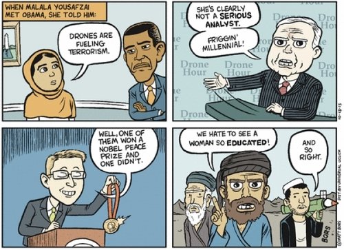 A few anecdotes about Malala attracted me to reading her book: 1) she is a socialist, ((“I am convinced Socialism is the only answer and I urge all comrades to take this struggle to a victorious conclusion. Only this will free us from the chains of bigotry and exploitation.” See “Historic 32nd congress of Pakistani section of IMT – First Day,” In Defense of Marxism, 10 March 2013.)) and 2) her courage was intact when she criticized United States president Barack Obama on the use of drones.