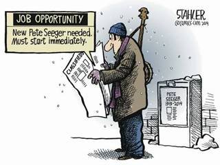 Now with his loss, we realize it is quite a gap to fill. Indeed, one political cartoon showed a hapless banjo player reading his paper’s page: “JOB OPPORTUNITY: New Pete Seeger needed. Must start immediately.”