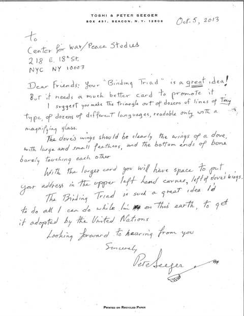“The Binding Triad is such a great idea I’d like to do all I can while I’m on this earth to get it adopted by the United Nations,” Seeger wrote in his letter and he included ideas on how to better sell the idea to the public.