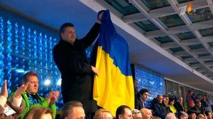 President of Ukraine Victor Yanukovych waving national flag as the Ukrainian team advanced to the stadium during Opening ceremony, Sochi, February 7, 2014.