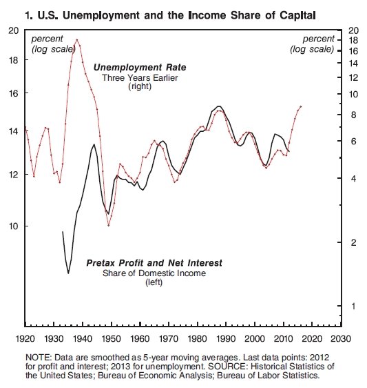 In principle, both scenarios are possible. But as Figure 1 shows, in America the second prevails: unemployment redistributes income systematically in favor of capitalists. The chart contrasts the share of pretax profit and net interest in domestic income on the one hand with the rate of unemployment on the other (both series are smoothed as 5-year moving averages). Note that the unemployment rate is lagged three years, meaning that every observation shows the situation prevailing three years earlier.