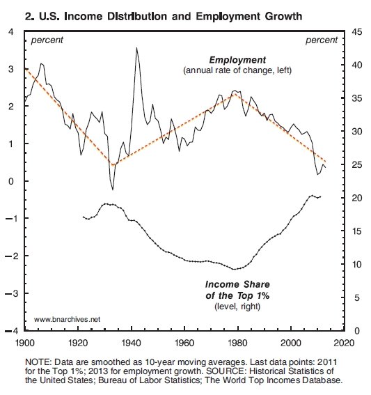 Historically, this negative relationship can be divided into three distinct periods, indicated by the dashed, freely drawn line going through the employment growth series. The first period, from the turn of the twentieth century till the 1930s, is the so-called Gilded Age. Income inequality is rising and employment growth is plummeting.
