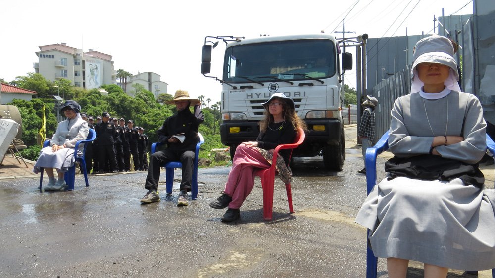 Priests and nuns, whose right to pray and celebrate the liturgy is protected by the Korean constitution, form a line in front of the gate. They sit in plastic chairs, for morning mass followed by recitation of the rosary. Police dutifully remove the priests, nuns and other activists about ten times over the course of the liturgy, allowing trucks to go through. The action slows down the construction process and sends a symbolic, daily message of resistance.
