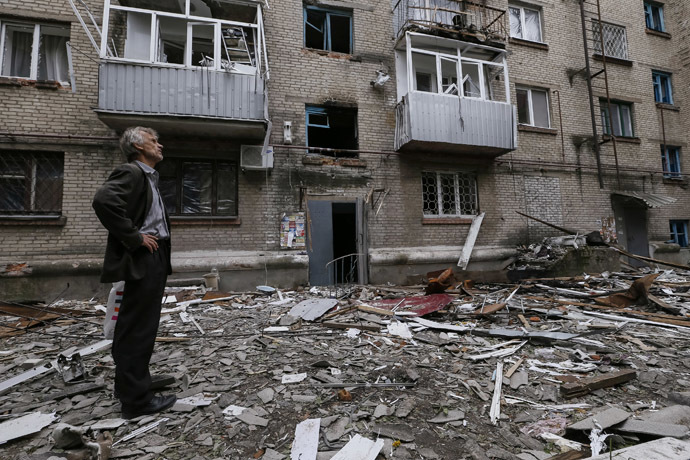 A man looks at a residential building, where he resides, which was damaged by what locals say was overnight shelling by Ukrainian forces, in the eastern Ukrainian town of Slaviansk June 12, 2014. (Reuters/Gleb Garanich)