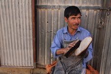 Rustom mends shoes, or waits for shoes to mend, 7 days a week, from 7:00 a.m. – 7:00 p.m., at the roadside. His “shop” consists of a box containing equipment and a primitive, portable overhead shelter. He sits on a ledge, under the blazing sun, (or in freezing cold during Afghanistan’s harsh winter).