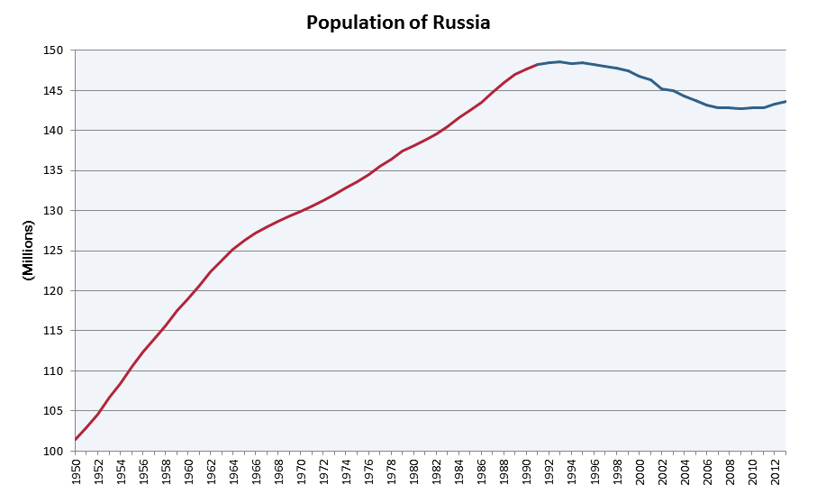 The population hit a historic peak at 148,689,000 in 1991, just before the breakup of the Soviet Union, but then began a decade-long decline, falling at a rate of about 0.5% per year due to declining birth rates, rising death rates and emigration. The decline slowed considerably in the late 2000s, and in 2009 Russia recorded population growth for the first time in 15 years, adding 23,300 people. Key reasons for the slow current population growth are improving health care, changing fertility patterns among younger women, falling emigration and steady influx of immigrants from the ex-USSR countries. In 2012, Russia’s population increased by 292,400 people.[12] As of 2013, Russian TFR of 1.707 children per woman was the highest in Eastern, Southern and Central Europe. In 2013, Russia experienced the first natural population growth since 1990 at 22,700 people. Taking into account immigration, the population grew by 294,500 people. (Emphasis, jw)