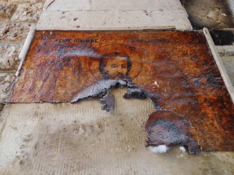 When terrorists — no, not Da‘ish, but al-Nusra and the so-called “FSA” — terrorized the ancient village of Ma‘loula for eight months, they meted out considerable destruction and damage on this heritage site, as well as looted and burned the town’s monasteries and historic buildings. They burned the shrine containing the remains of St. Thekla, stole her bones. They vandalized icons and frescoes in the church in the Convent of St. Thekla, and burned parts of the church itself. They shelled and looted icons from the Monastery of Sts. Sergius and Bacchus (see video report, “Syrian historical treasures and archeological artifacts destroyed or stolen by terrorist gangs”).