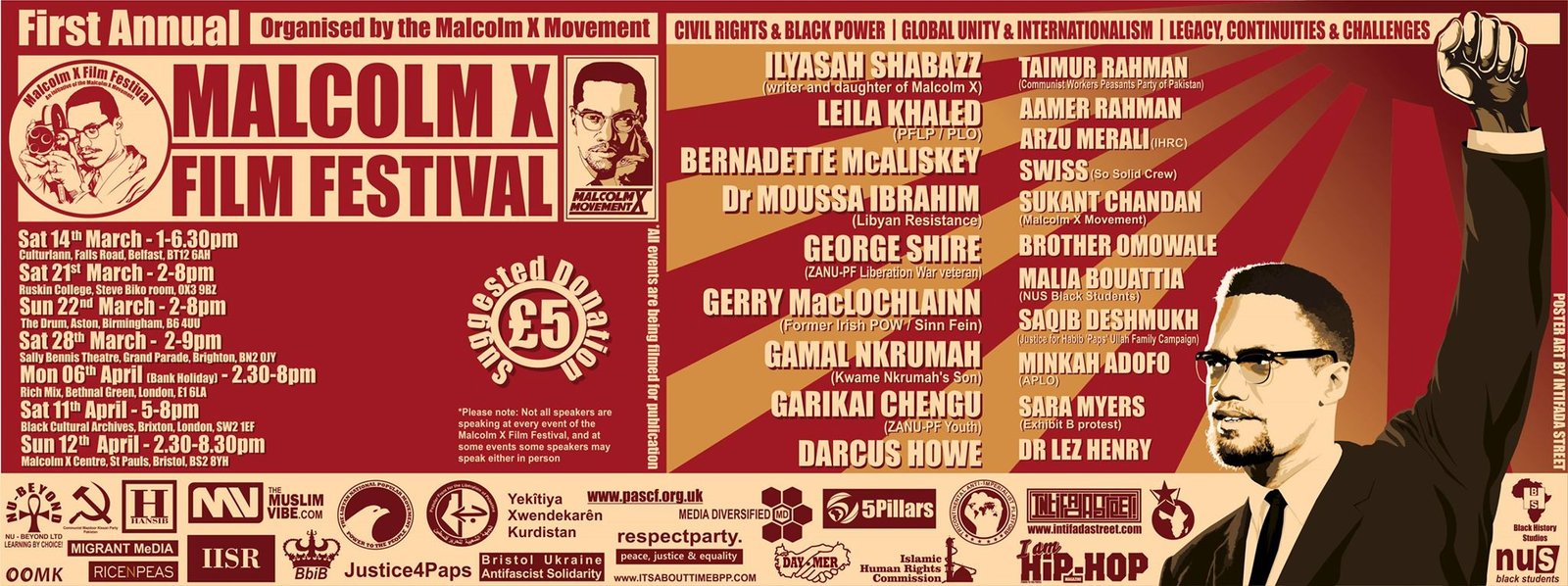 In late 2014 we began tentatively organising towards the first annual Malcolm X Film Festival as a three day event only in London, which has now turned into a series of seven events in at least six cities including in occupied Ireland (‘Northern Ireland’) in Belfast with other cities as other activists wanted to host events. The film festival is a truly historical political event for radical Black and Asian politics on this island for several reasons. It is the biggest initiative of decolonial Black and Brown led politics on this island for the last 25 years or so. Unfortunately not since the last years of the Radical Third World Bookfair has this country seen such.