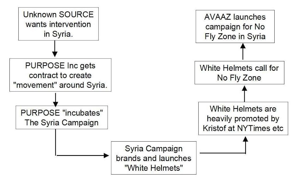 Following is a brief description documenting the flow of misinformation and deceit, beginning at the Source and ending with Avaaz’s campaign for NATO/US attack on Syria.