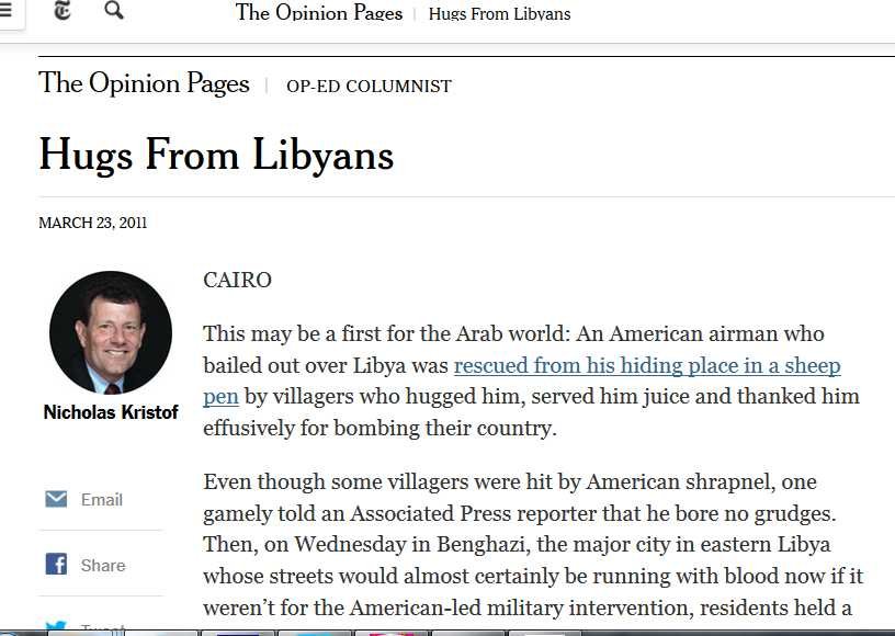 The “White Helmets” campaign has been highly successful because of uncritical media promotion. Nicholas Kristof of the New York Times was an advocate of the NATO/US attack on Libya. According to him, villagers who had been shot, injured and their homes destroyed were not bitter, they were thankful! . “Hugs from Libyans” is how he viewed it. It was, of course, nonsense, helping to pave the way in the invasion and destruction of the country.