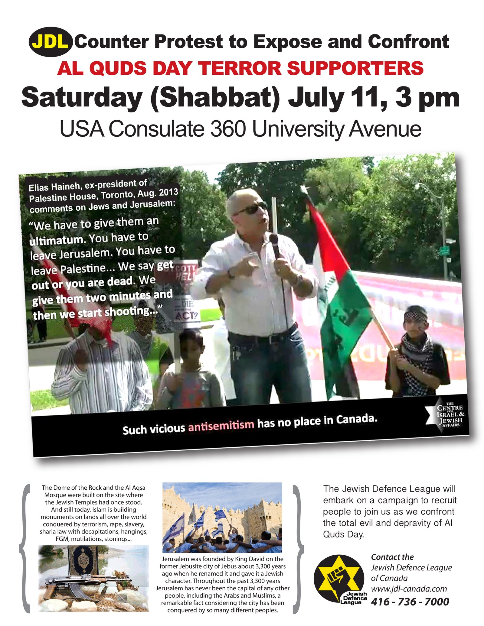Last year 5,000 demonstrated, faced by threats from 1,000 Zionists, necessitating a heavy police presence. No other cause unites Canadians around international justice like the cause of the Palestinians. Organizer Seyed Rizvi said 70 organizations took part, including the Jewish Neturei Karta and Independent Jewish Voices. “Our supporters are people who feel bad when they see the pictures and images of what is going on in Palestine. We believe the Zionists are not representative of the Jewish religion. We have seven rabbis here in support of us.”