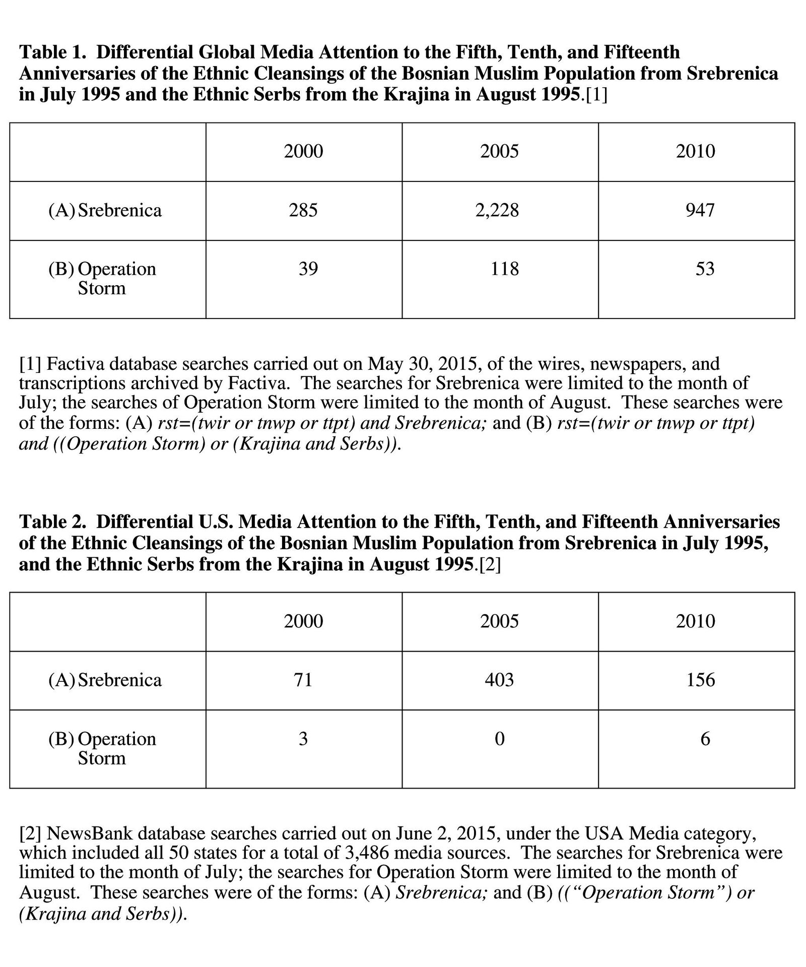 As Table 1 shows, mainstream Western media sources have given the fifth, tenth, and fifteenth anniversaries of the fall of Srebrenica and the sufferings of the “worthy” Bosnian Muslim population far more attention than this same collection of media has ever awarded the fall of the Republic of Serb Krajina and the sufferings of the “unworthy” Krajina Serbs. But these numbers actually understate the bias of the Western media in treating these cases of “worthy” and “unworthy” victims. This is a result of the fact that the bulk of the attention to the “unworthy” victims was given by media from the new states formed during the breakup of Yugoslavia, plus brief mention by wire services such as Agence France Presse, Associated Press, Inter Press Service, Reuters, and RIA Novosti, as well as by the Irish Times.